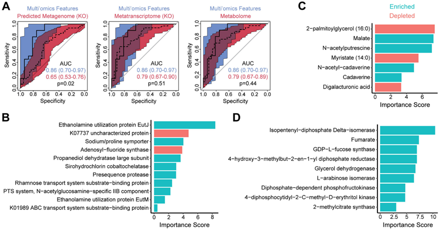 (a) 将由差异丰富的预测基因、转录本和代谢物(红色)构建的随机森林分类器的 ROC 曲线与多组学分类器(蓝色)的 ROC 曲线进行比较。 (b-d) 图中显示了转录组学、代谢组学和多组学分类器中包含的特征的重要性评分,条形颜色表示IBS-D中富集或缺失的特征。