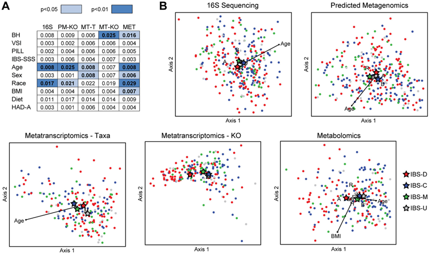 在确定了区分肠易激综合征和HC的强大微生物谱后,他们评估了肠易激综合征中微生物组成和功能与表型的关系。肠道习惯亚型与宏转录组学和代谢组学显著相关,但与微生物组组成或预测的宏基因组无关。在确定了区分 IBS 和 HC 的微生物特征后,他们评估了 IBS 内微生物组成和功能与表型的关系。排便习惯亚型与宏转录组学KO和代谢组学显著相关,但与微生物组组成或预测的宏基因组无关(图5A-B)。内脏敏感性 (VSI)、一般身体症状感知 (PILL) 和 IBS 特异性症状严重程度 (IBS-SSS) 与转录本、预测基因和代谢物的整体微生物组组成或功能均不显著相关。