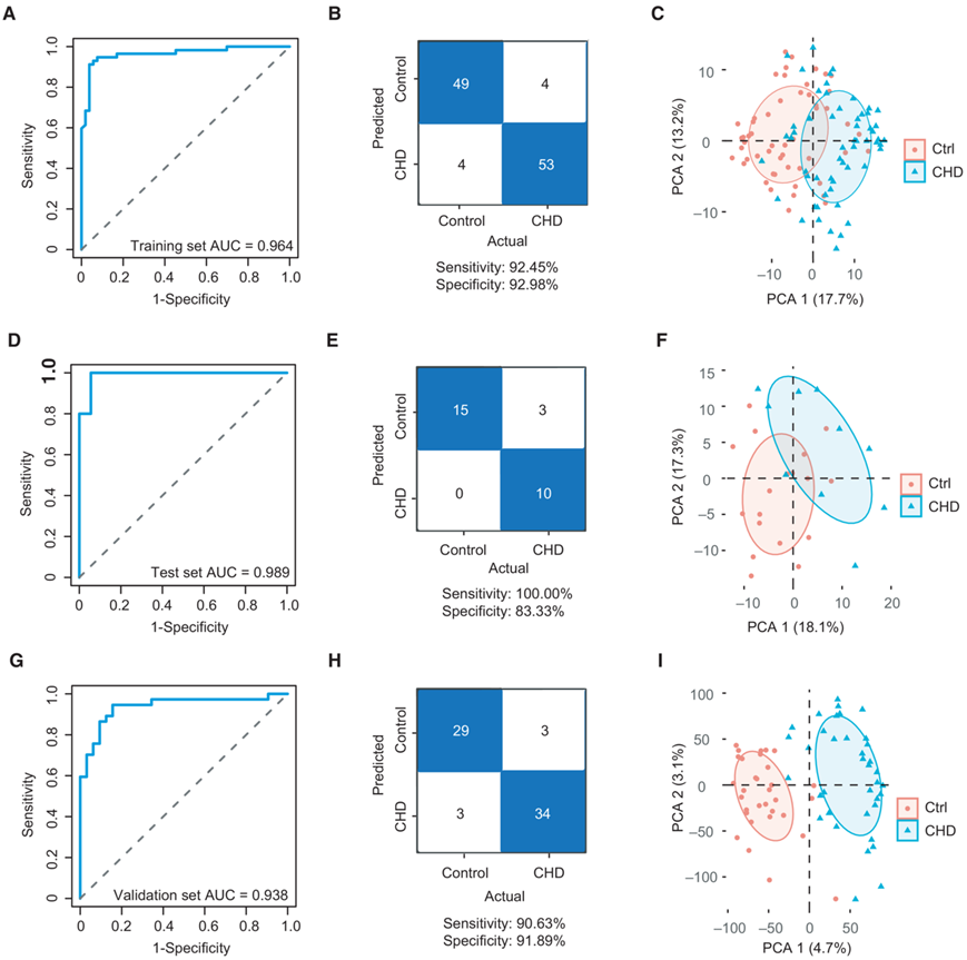 (A-C) 第 1 组训练数据集的受试者工作特征 (ROC) 曲线,训练数据集中组合生物标志物的混淆矩阵,以及用于预测 CHD 和对照结果的 PCA 图。 (D-F)第 1 组测试数据集的 ROC 曲线,测试数据集中组合生物标志物的混淆矩阵,以及用于预测 CHD 和对照结果的 PCA 图。(G-I) 第 2 组中外部验证集的 ROC 曲线,外部验证集中组合生物标志物的混淆矩阵,以及用于预测 CHD 和对照结果的 PCA 图。