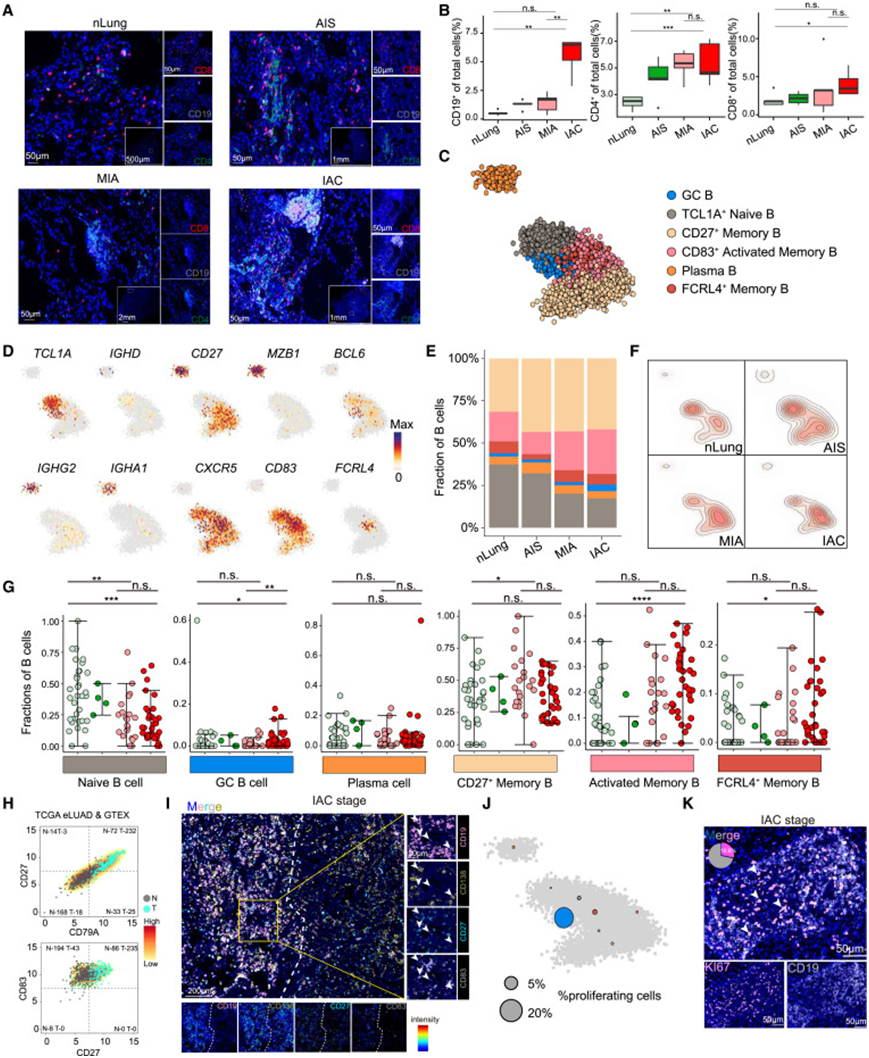(A) LUAD 患者的肿瘤切片染色。(B)分别显示总细胞中CD19 + /CD4 + /CD8 +细胞定量的箱线图。(C) 所有 nLung 和 LUAD 样本中 B 细胞亚聚类的二维投影,显示了六个主要聚类的形成。(D) 选定的 B 细胞标记基因在细胞模型上的 2D 投影。(E) 条形图显示每组中 nLung 以及 AIS、MIA 和 IAC 患者内的 B 细胞类型组成。(F) nLung 和 AIS、MIA 和 IAC 患者的 B 细胞用等高线显示,表明投影细胞的密度。(G) 点图显示 nLung 以及 AIS、MIA 和 IAC 患者中 B 细胞亚群的百分比。(H)密度图显示了TCGA I期LUAD和基因型组织表达(GTEx) nLung数据中分别表达高水平CD79A和CD27以及CD27和CD83的肿瘤样本和nLung组织的比例。(I) LUAD 患者的肿瘤切片染色。(J) 每个宏细胞增殖 B 细胞的分数。(K) LUAD 患者的肿瘤切片染色。