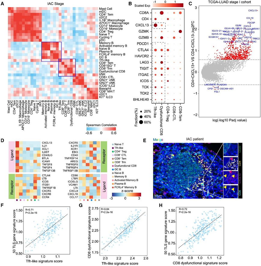 (A) 33 个 IAC 肿瘤中谱系归一化细胞类型频率的相关性。(B) IAC 浸润 T 细胞聚类中选定基因的表达。(C) 火山图显示 I 期 LUAD TCGA 患者的差异表达基因 (DEG)。(D) 热图显示 B 细胞和 T 细胞中高度表达的配体-受体对的表达。(E) IAC 患者的肿瘤切片染色。(F) 散点图显示 50 个 TLS 基因特征得分(y 轴)的基因表达与 Tfh 样特征得分(x 轴)的差异。(G) 散点图显示功能失调的 CD8+ T 特征得分(y 轴)的基因表达与 Tfh 样特征得分(x 轴)的差异。(H) 散点图显示 50 个 TLS 基因特征得分(y 轴)的基因表达与功能失调的 CD8+ T 特征得分(x 轴)的差异。