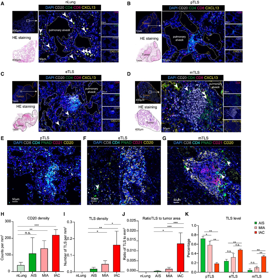 (A–G)多重免疫染色分析。 (H–J) nLung 以及 AIS、MIA 和 IAC 患者中 CD20 + B 细胞的定量、TLS 密度以及 TLS 所占肿瘤面积的比率。(K) AIS、MIA 和 IAC 患者不同阶段 TLS 的量化。