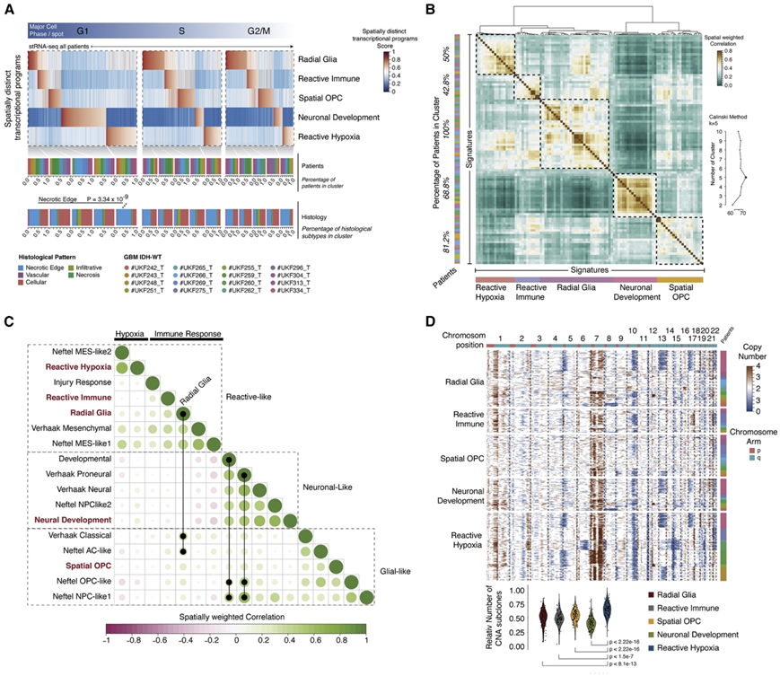 本项研究通过空间转录组学、代谢组学和蛋白质组学来表征胶质母细胞瘤。通过破译患者之间区域共有的转录程序,推断胶质母细胞瘤是通过谱系状态进行空间分离,并适应炎症和/或代谢刺激。代谢成像和成像质谱流式细胞分析数据的整合揭示了局部肿瘤-宿主的相互依赖性,从而产生了空间排他性的适应性转录程序。推断拷贝数改变强调了与反应性转录程序相关的亚克隆的空间内聚组织,证实环境压力会产生选择压力。模拟各种环境的胶质母细胞瘤干细胞植入人类和啮齿动物新皮质组织的模型证实转录状态源于对各种环境的动态适应。