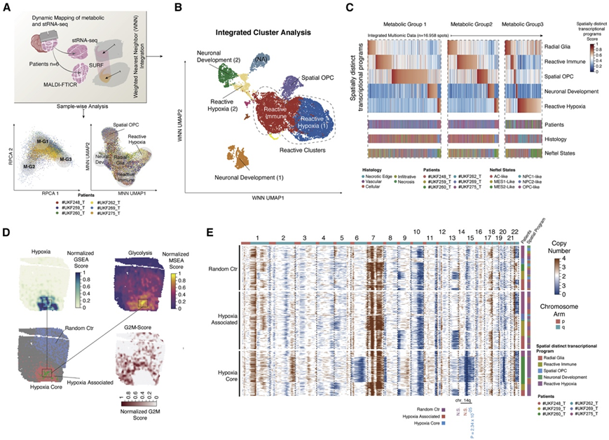 (A) 整合 6 名患者的转录和代谢组数据的实验流程。(B)使用PCA (RPCA 1-2)对患者代谢数据进行水平整合的散点图,以及使用互近邻(MNN)整合(MNN均匀流形近似和投影[UMAP] 1-2)对转录组数据进行水平整合的散点图。(C)所有整合点的空间分解转录组学热图。(D) 样品 #UKF 275_T 中集成分析的曲面图。(E) 缺氧表型的拷贝数热图。