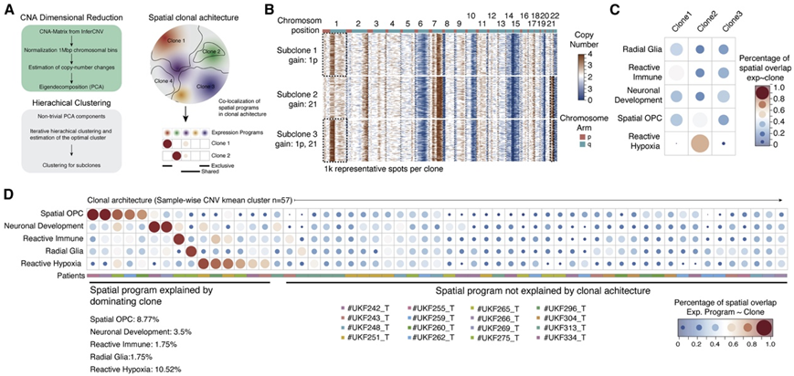 (A) 实验流程概述(左)以及亚克隆内空间结构和转录程序概念的说明。(B) 样本 #UKF 260_T 的 CNA 热图显示 3 个主要亚克隆。(C) 点图表明来自示例 #UKF 260_T 的转录亚组(行)和亚克隆(列)之间的空间重叠。(D) 点图表明所有亚克隆的转录亚组(行)和亚克隆(列)之间的空间重叠。