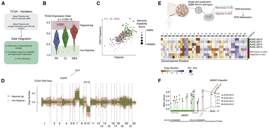 (A) TCGA 数据分析的概述和实验流程。(B) TCGA 数据验证。(C) CNA 频率和缺氧评分的散点图。(D) 全基因组中 TCGA 数据的 CNA 映射。(E) 在低氧或常氧条件下培养的 4 名患者的原代细胞培养物的实验验证。(F) MGMT TSS1500 处的 CpG 岛–第一个外显子。y 轴显示甲基化β值。lollipop图显示了 MGMT 启动子处缺氧应激反应之间的差异甲基化。