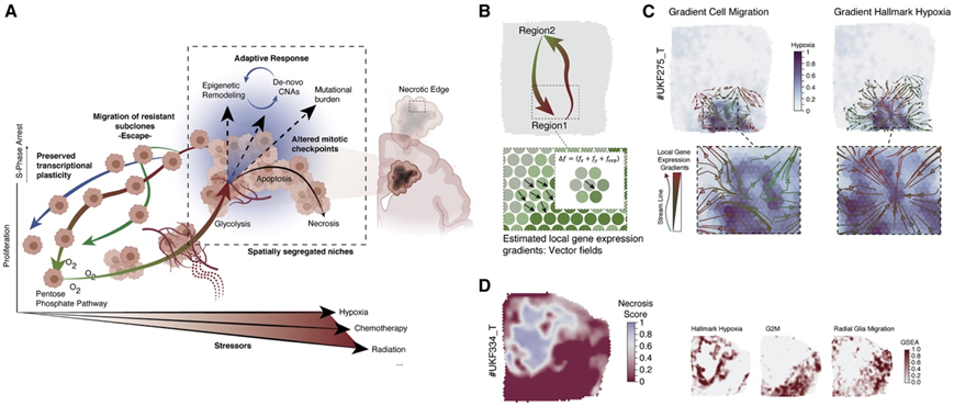 (A)增殖-缺氧相互依赖假说的概念和模型。(B) 矢量场计算模型,由基因表达水平空间变化的对齐梯度组成,并指示迁移激活的方向。(C) 空间转录组示例的曲面图 (#UKF275_T)。箭头表示来自定义的转录程序的向量场(显示为流线)。(D) 表面图 (#UKF334_T) 指示坏死(左图)与缺氧富集(左起第二个)、细胞周期(G2M 左起第三个)和放射状胶质细胞迁移(左起最后一个)之间的关系。