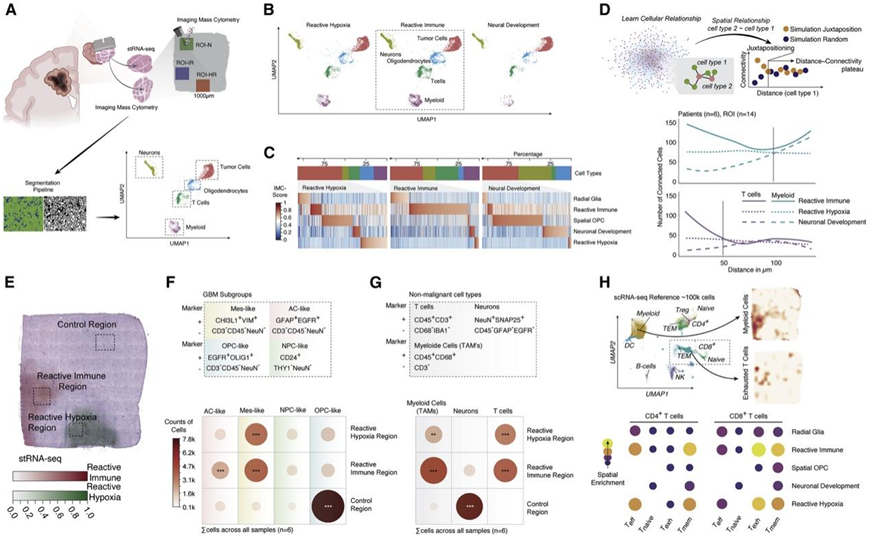 (A) 成像质量细胞计数数据在空间转录组数据中整合的图示。(B) 主导空间解析转录模式的不同区域中细胞类型的UMAP可视化。(C) 淋巴和骨髓细胞在空间解析转录模式中变化的条形图(上)。注释的空间分辨亚型的肿瘤细胞多样性热图(下)。(D) 细胞关系量化工作流程图示(上)。肿瘤细胞与骨髓(青色)或淋巴(紫色)细胞之间的细胞连接性的量化(下)。(E) 以 #UKF275 的 H&E 为例,表示不同的反应性免疫(红色)和缺氧(绿色)区域。(F-G) 每个分区和细胞类型的细胞计数图示。(H) 以骨髓细胞(右上)和效应 T 细胞的细胞位置反卷积为例,胶质母细胞瘤免疫区室的UMAP可视化(上),CD4+和 CD8+ T 细胞亚型的空间富集热图(下)。
