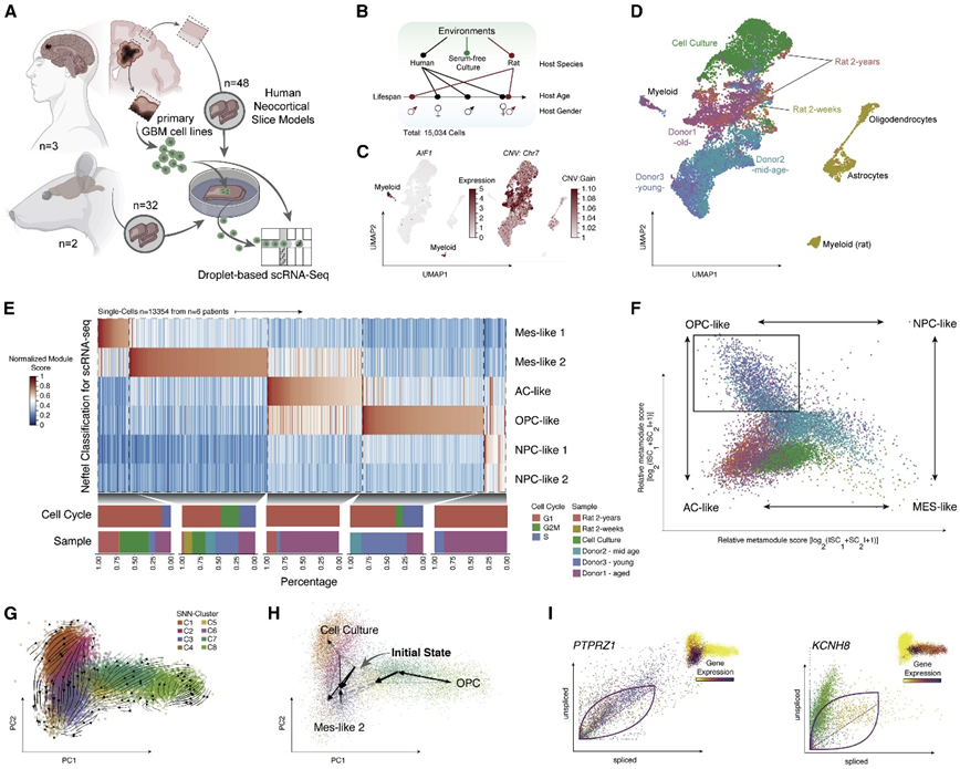 (A) 测试不同宿主环境对肿瘤细胞影响的工作流程图示。(B) 宿主环境的概述。(C) 由 AIF1(骨髓细胞)和 7 号染色体(肿瘤细胞)中的增益标记的 scRNA-seq 的降维 UMAP 2D 表示。(D) 所有集成 scRNA-seq 数据的降维 UMAP 表示。(E) 转录亚型的富集分析。(F)四种主要细胞状态的火山图。(G)通过速度流线可视化的主要基因平均流量对应于注射到不同组织供体内后的肿瘤细胞分化。(H) 使用 CellRank 以类似于 (G) 的表示形式估计初始和最终状态。(I) 未剪接基因表达(y 轴)和剪接基因表达(x 轴)的散点图展示了不同聚类内剪接动力学的转录动力学。