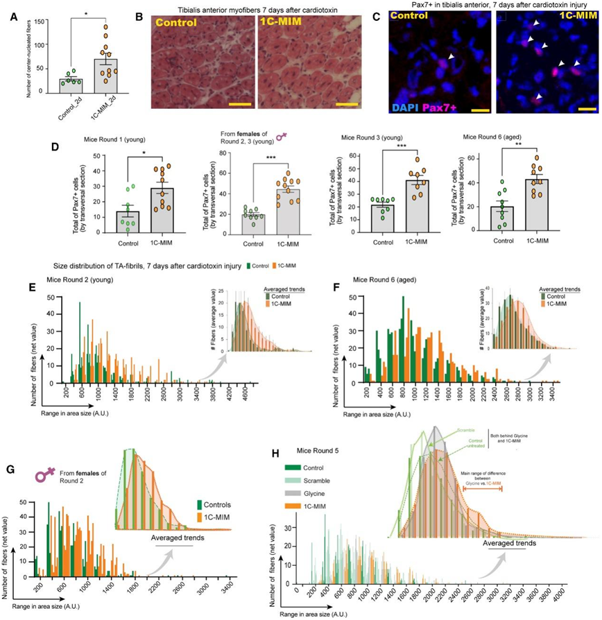 激活的卫星细胞(SC)在CTX损伤后的第7天非常突出,超过11天就会减少。他们观察到,1C-MIM确实增强了这种激活过程,且Pax7+细胞水平的显著增加(图5C-D)。此外,在再生过程中,与未治疗的小鼠相比,补充1c - mim的小鼠肌纤维的横截面积增加,表明这种干预加速了恢复(图5E-G)。在没有损伤的对照动物中,1C-MIM干预对肌纤维大小没有影响。值得注意的是,3个月的干预并没有影响肌纤维的大小(图5H),而3个月的甘氨酸补充有影响,如其他人报道的那样增加了肌纤维的大小,但补充1C-MIM的效果仍然更好(图5H)。