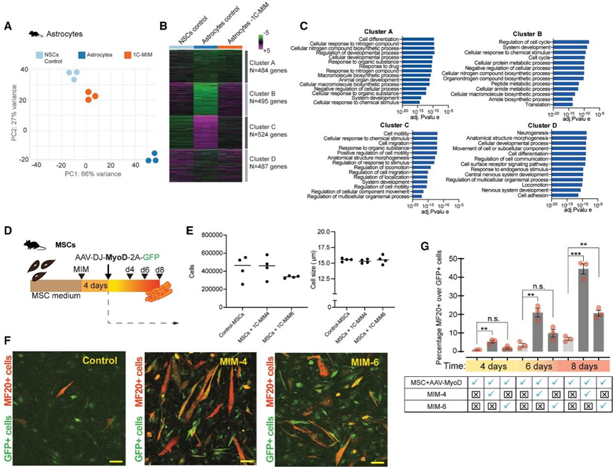 (A–C) 补充 1C-MIM 后星形胶质细胞获得的身份的转录特征。(D–G) 1C-MIM 加速 MSC 转化为 MB 的功能测定。