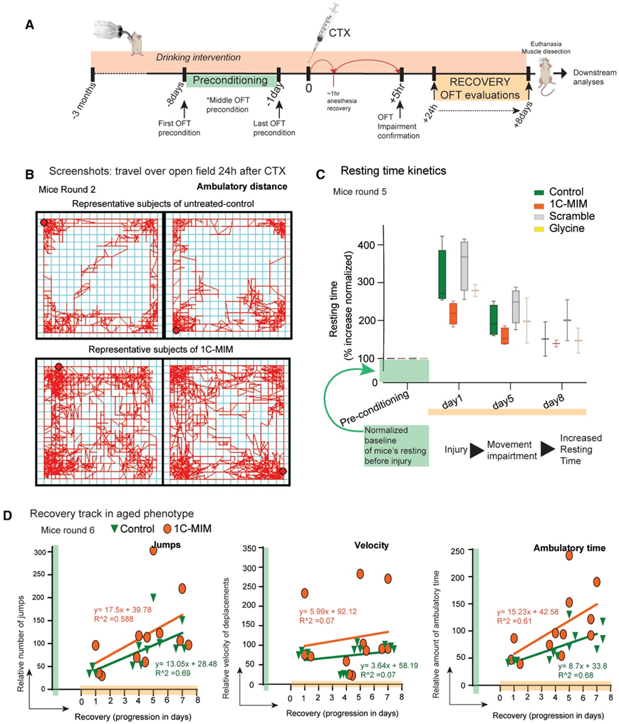 接下来,为了验证 1C-MIM 的潜在可翻译性,他们进行了体内干预,选择了心脏毒素(CTX)引起的肌肉退化模型,它会损伤肌肉纤维,随后激活涉及连续转化细胞事件的修复机制。作为体内验证的一部分,他们比较了接受干预的年轻和年老小鼠的运动能力。作为第一步,将小鼠预先适应旷场测试(在诱导损伤前至少 1 周将小鼠放置在该区域 1 小时并 2-3 次)(图4A)。接下来,他们证实CTX损伤损害了小鼠的运动,观察到运动反应在速度和跳跃方面的减少,以及休息时间的增加。有趣的是,仅在损伤后24小时,他们观察到补充1C-MIM的小鼠的行走距离增加,因此休息时间减少(图4B-C)。只检测到跳跃次数和移动时间等其他参数的改善趋势:跳跃次数和移动时间的相对变化占再生进程的59%和61%,而速度变化不占恢复的比例(图4D)。值得注意的是,休息时间是显示 CTX 损伤后各组之间最相关差异的参数(即小鼠休息时间更长)。总之,与其他对照补充剂相比,补充 1C-MIM 的小鼠运动恢复更快;位居第二的是补充甘氨酸的组;最后是未经处理的对照小鼠和(图 4 C)。总体而言,随着肌肉再生(恢复)的进展,小鼠减少了休息时间(同样增加了行走距离)。