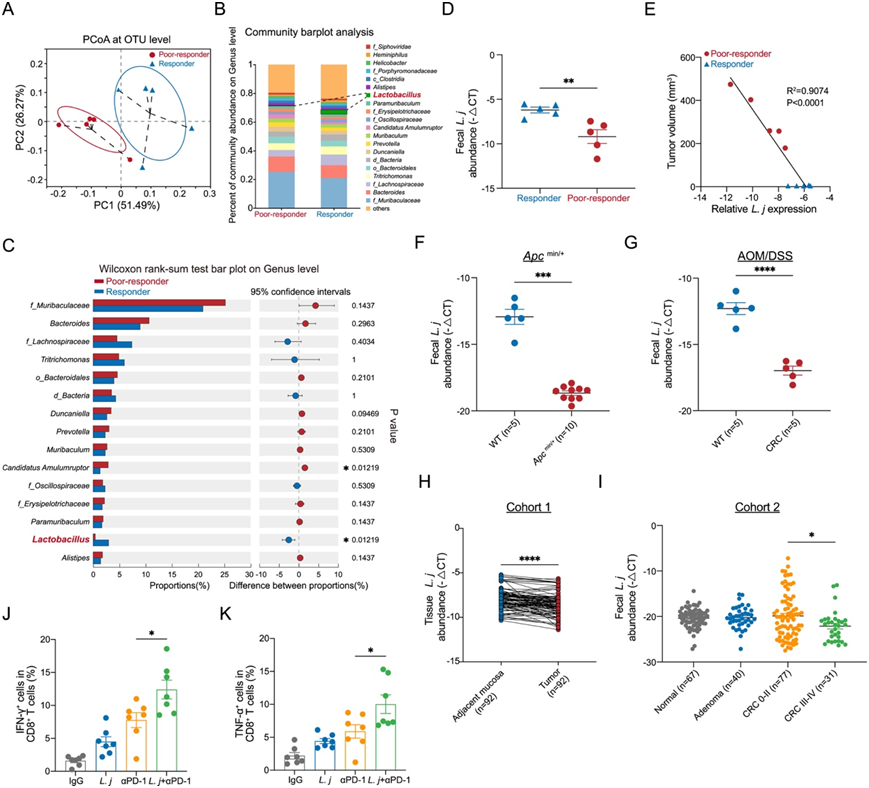 然后,他们对反应不良小鼠和反应小鼠的粪便进行宏基因组学和16S核糖体RNA (rRNA)测序,以比较微生物群落。通过主坐标分析(PCoA)观察到β多样性存在差异(图1E,图S1A)。在属水平上的菌落组成分析显示,反应不良组的乳酸杆菌丰度下降(图1F,图S1B-C)。在种水平上,约氏乳杆菌最为普遍(图1G)。在不良反应组中,较低丰度的约氏乳杆菌与肿瘤发生负相关(图S1D-E)。Apcmin/+或氧化偶氮甲烷(AOM)/葡聚糖硫酸钠(DSS)诱导的结直肠癌小鼠也显示出约氏乳杆菌定植减少(图S1F-G)。同样,与邻近的正常组织相比,约氏乳杆菌在人CRC组织中的丰度显著降低(图S1H),并且与人CRC的晚期呈负相关(图S1I)。