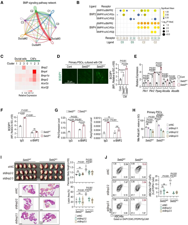 (A) 通过 CellChart 定量推断成纤维细胞和导管细胞之间 BMP 信号网络的相互作用。(B) 使用 CellphoneDB 绘制导管细胞和成纤维细胞之间显著受体-配体相互作用的点图。(C) 点图显示 scRNA-seq 中导管和 CAF 亚群中所示基因的相对表达水平。(D) 用Setd2 WT和Setd2 KO胰腺肿瘤细胞的条件培养基 (CM) 和对照培养基培养的 PSC 中 BODIPY 493/503 水平的代表性图像和统计分析。(E) 对 (D) 的 PSC 中指定基因进行 qPCR 测定。(F) PSC 中的 BODIPY 493/503 水平。(G) 对 (F) 的 PSC 中指定基因进行 qPCR 测定。(H) 具有来自Setd2 WT和Setd2 KO胰腺肿瘤细胞(w/或 w/o Bmp2敲低)的 CM 的 PSC 中的尼罗红水平。(I)胰腺重量、H&E 染色和病变面积百分比。(J) 来自指定胰腺肿瘤的 ABCA8a + FAP + CAF的细胞比例的代表性图和统计分析。