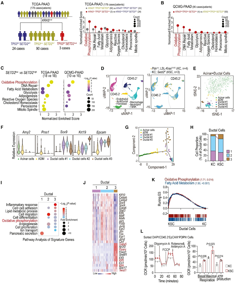 (A-B) 基于指示的突变状态对 TCGA-PAAD 和 QCMG-PAAD 数据集中的基因表达进行基因集富集分析 (GSEA)。(C) TCGA-PAAD和qcg - paad数据集中SETD2low和SETD2high组的GSEA比较。(D) UMAP可视化。(E) 腺泡和导管细胞的重新聚集,以 t-SNE 图表示。(F) 小提琴图显示所选标记基因的标准化表达。(G) 腺泡和导管亚群的伪时间轨迹分析。(H) KC 和 KSC 中导管亚聚类的比例。(I) 对指定导管亚聚类的基因进行 GO 富集分析。(J) 热图通过 SCENIC 分析显示每个导管亚聚类中富集的转录因子。(K) KC 和 KSC 之间所有导管细胞中基因表达的 GSEA 分析。(L) 从 KSC 和 KC 小鼠胰腺组织中分选的肿瘤细胞的耗氧率 (OCR)。