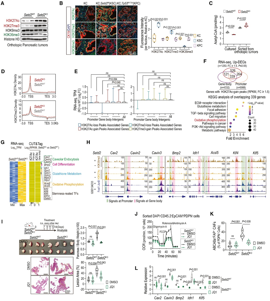 (A) 原位Setd2 WT和Setd2 KO胰腺肿瘤中的组蛋白修饰标记。(B) KC、KSC 和 KPC 小鼠胰腺切片中 H3K27Ac、H3K27me3 或 H3K36me3(绿色)和 CK19(红色)的免疫荧光染色。(C) 来自原位肿瘤的所示培养或分选的 PDAC 细胞中的细胞乙酰辅酶 A 水平。(D) 从转录起始位点 (TSS) 上游 3000 bp 到转录终止位点 (TES) 下游的 H3K27Ac 或 H3K27me3 的密度。(E) 箱线图显示具有 H3K27Ac 或 H3K27me3 差异沉积的指定基因集的归一化转录变化。(F) 与显示 H3K27Ac 增益峰的基因重叠的上调基因的维恩图,并对重叠基因进行 KEGG 通路分析。(G) 热图显示 339 个重叠基因的启动子和基因体区域中 H3K27Ac 沉积的 mRNA 水平和差异倍数。(H) Setd2 WT和Setd2 KO肿瘤细胞中 H3K27Ac 和 H3k27me3 CUT&Tag 信号的 IGV 屏幕截图,以及来自胰腺肿瘤细胞的 JunB 和 Fosl1 ChIP 信号。(I)定量胰腺重量和病变面积。(J)胰腺原位肿瘤中分选的肿瘤细胞的 OCR。(K)通过流式细胞对来自所示肿瘤的ABCA8a + FAP + CAF的细胞比例进行统计分析。(L)使用 DMSO 或 JQ1 治疗的Setd2 WT和Setd2 KO肿瘤中指定基因的相对 mRNA 水平。