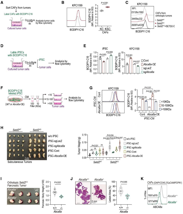 (A) BODIPY-C16从CAF转移到肿瘤细胞的示意图。(B-C) KPC1199 与来自指定肿瘤的 BODIPY-C16 标记的 CAF 共培养中的 BODIPY-C16 水平。(D-E) Abca8a过表达 (Abca8a -OE) 和Abca8a耗尽 (sg Abca8a ) iPSC 与 KPC1199 共培养的示意图,评估 BODIPY-C16 水平。(F-G)用 BODIPY-C16 标记的 Abca8a -OE iPSC 的示意图,以及用于评估 BODIPY-C16 向肿瘤细胞转运的条件培养基 (CM) 级分。(H) 肿瘤重量。(I-J)对相对胰腺重量和病变面积进行定量。(K) 来自所示小鼠的原代 CAF 上的 ABCA8a 水平。