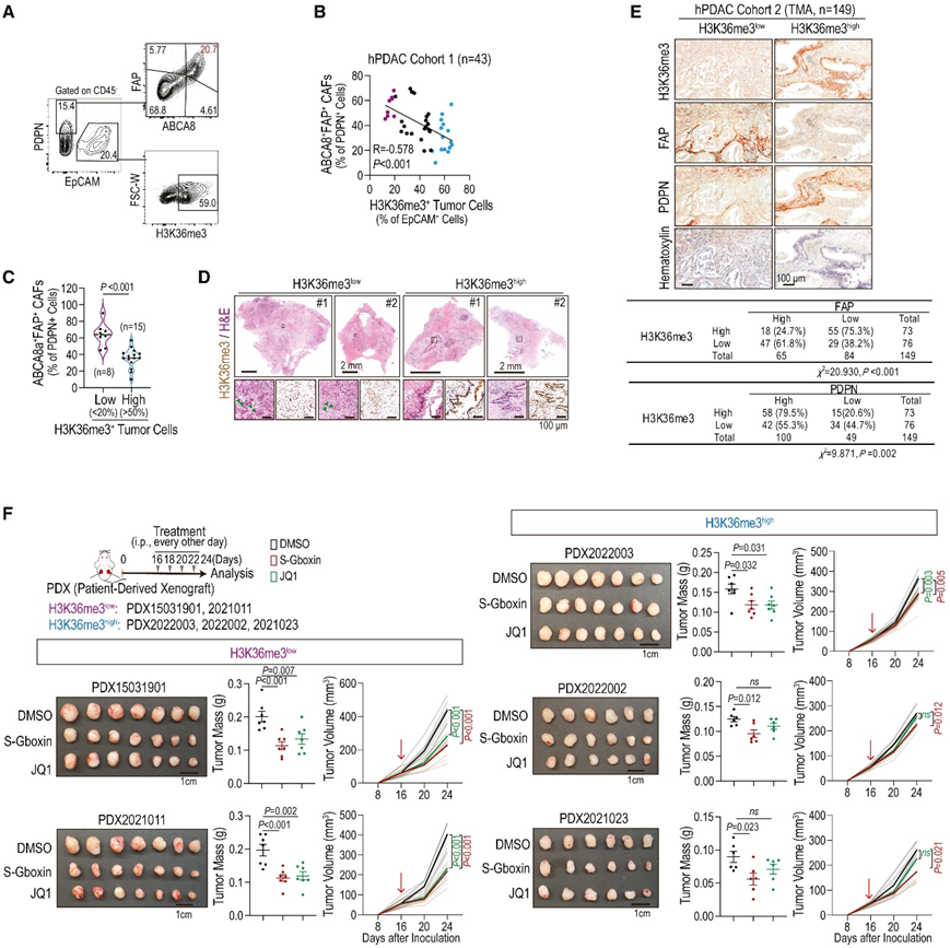 (A)对 PDAC 患者原发肿瘤组织中ABCA8a + FAP + CAF 和 H3K36me3 +肿瘤细胞的细胞比例进行流式细胞分析。(B) ABCA8a + FAP + CAF 与 H3K36me3 +肿瘤细胞的细胞比例之间的相关性。(C) H3K36me3 +肿瘤细胞水平低和高的 PDAC 患者中ABCA8a + FAP + CAF 的细胞比例。(D) PDAC 患者原发性肿瘤组织中 H3K36me3 的代表性 H&E 和免疫组织化学染色。(E) PDAC TMA 中 H3K36me3、FAP 和 PDPN 多重免疫组织化学染色的代表性图像。(F) 在患者来源的异种移植 (PDX) 模型中进行治疗,评估肿瘤质量和体积。