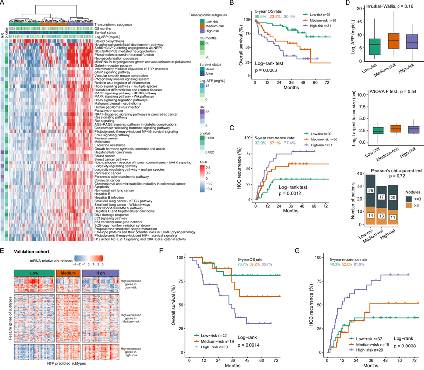 (A) 热图表示三个 RNA-seq 亚组中显著富集的通路。(B-C) 基于 RNA-seq 亚组的 OS 或 HCC 复发的 Kaplan-Meier 曲线。(D) 三个RNA-seq 亚组的AFP水平和肿瘤大小的箱线图以及肿瘤结节的柱状图。(E) 使用 NTP 方法将验证队列(来自大连医科大学附属第二医院和青岛大学附属医院)样本分为三个亚型。热图显示了具有亚型预测(FDR < 0.01)的样本中特征基因的 RNA-seq 表达谱。(F-G) 基于验证队列中 RNA-seq 亚组的 OS 或 HCC 复发的 Kaplan-Meier 曲线。