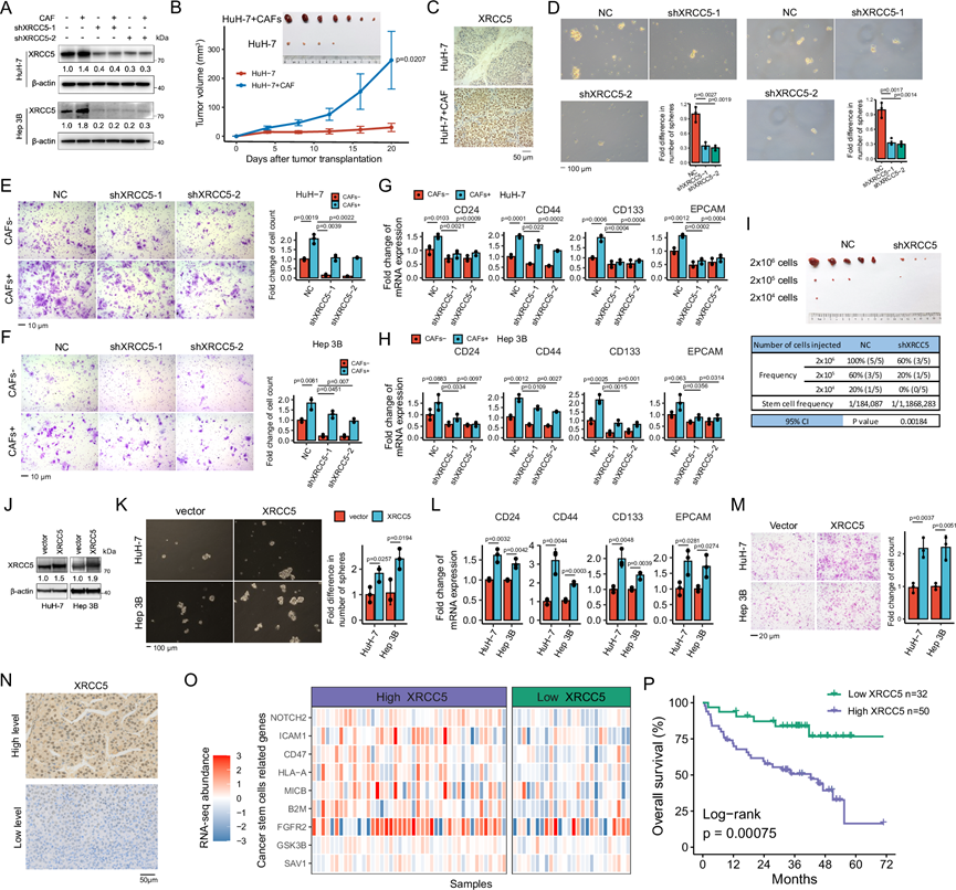 为了在本研究中确定 CAF 和癌症干性之间的联系,他们选择了 DNA 修复蛋白 XRCC5,该蛋白很少有报道涉及促进癌症干性。在 CAF培养基中培养的 HCC 细胞中 XRCC5 水平升高(图 5A)或与 CAF共同接种到裸鼠体内时。与 CAF共同接种的 HuH-7 细胞异种移植瘤的生长速度明显快于单纯的 HuH-7 细胞异种移植瘤(图 5B-C)。然后,他们使用基于慢病毒的方法在 HCC 细胞中建立稳定的 XRCC5 敲低(图 5A)。 XRCC5 敲低导致肝球形成减少近 70%(图 5D),并导致迁移能力降低约 80%,以及恢复由 CAF 诱导的迁移能力(图 5E-F)。XRCC5 的降低抑制了 CSC 标志物的 mRNA 表达,并抑制了 CAF 诱导的 CSC 标志物(例如CD24、CD44、CD133和EPCAM )的上调(图 5G-H)。此外,他们还通过将 shNC 或 shXRCC5 HuH-7 细胞以三种稀释度(2 × 106、2 × 105和 2×104)皮下注射到 NOD/SCID 小鼠体内并使其生长四周来分析 XRCC5 敲低的 HCC 细胞的致瘤性(图 5I)。计算了使用有限稀释法的 1/(干细胞频率)的置信区间(CI)。XRCC5敲低组的干细胞频率(1/CI)为 1/1868283,而 NC HuH-7 细胞中的干细胞频率为 1/184087。同样,XRCC5 的过表达也显著促进了 HCC 细胞中癌症干性的表型(图5J-M)。最后,为了初步确认XRCC5的临床作用,他们对来自衍生队列的82个HCC样本进行了XRCC5的免疫组织化学(IHC)染色(图 5N),绘制了与CSC相关基因的热图(图 5O),XRCC5高表达预示该队列的OS更差(图 5P)。多变量分析显示,XRCC5高表达是超越米兰标准的HCC LT的独立预后指标。