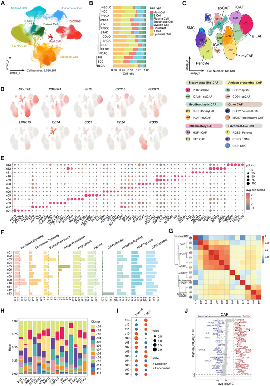 (A) 15 种组织和肿瘤类型的整合 scRNA-seq 图谱的 UMAP。(B) 按癌症类型划分的主要细胞类型比例。(C) 成纤维细胞聚类的 UMAP 显示 13 个 CAF 亚群。(D) 关键标记基因分析。(E) 气泡热图显示了成纤维细胞群体中特征基因的表达模式。(F) CAF 聚类的分子特征评分。(G) 热图显示了 CAF 子集之间的成对 Pearson 相关性,高度相似的 CAF 子集聚成相邻的模块。(H) 按癌症类型划分的 CAF 人口百分比。(I) 正常组织和肿瘤组织中成纤维细胞亚群的细胞丰度。(J) 将来自scRNA-seq的所有CAF亚群分为正常组和肿瘤组。