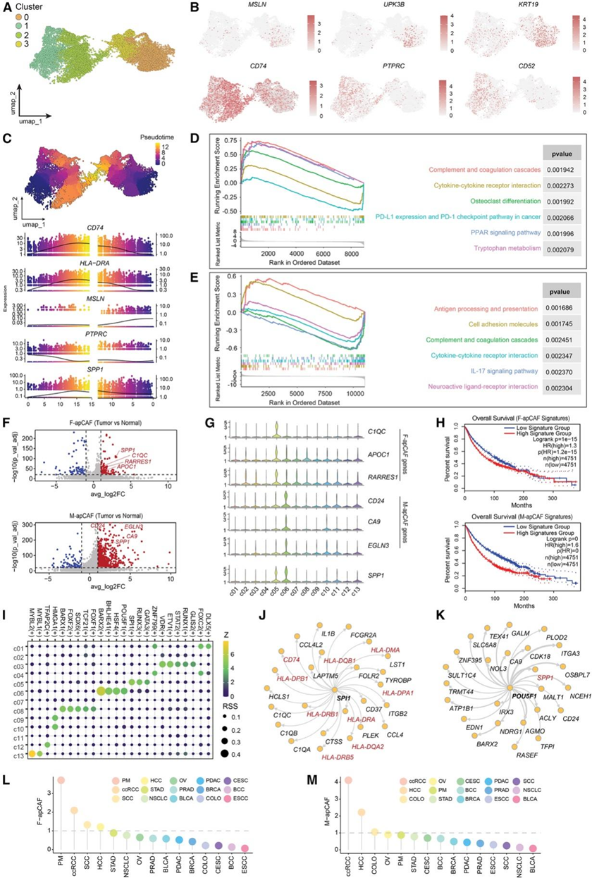 (A) 从图 1 C 中提取的所有 apCAFs(HLA II+)的 UMAP,重新聚类后揭示了四个亚聚类。(B) 特征基因的UMAP。(C) 伪时间轨迹(Monocle3)显示 apCAF 亚组之间存在两种不同的过渡轨迹。(D) F-apCAF 亚聚类(2 个亚聚类 vs. 1 个亚聚类)的 GSEA 分析。(E) M-apCAF 亚聚类的 GSEA 分析。(F) 两种apCAF群体中正常组织和癌组织之间的DEG。(G) 小提琴图显示了CAF 亚聚类中C1QC、APOC1、RARRES1、CD24、CA9、EGLN3和SPP1的表达。(H)生存分析。(I) CAF 亚群中转录因子的调控子活性评分。(J) 预测的F-apCAF中SPI1转录因子调控网络。(K) 预测的M-apCAF中POU5F1转录因子调控网络。(L) F-apCAF在不同癌症类型中的相对比例。(M) M-apCAF在不同癌症类型中的相对比例。