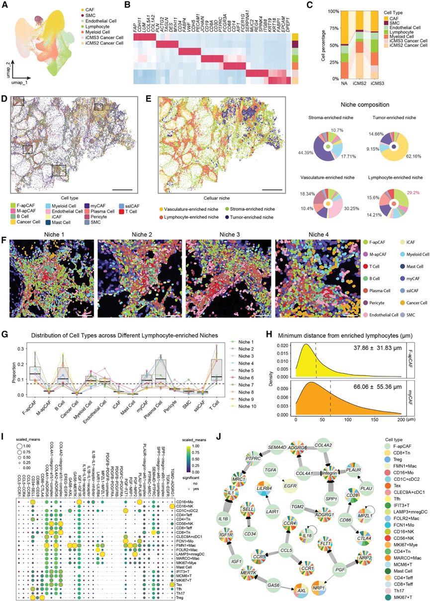 (A) 来自 Xenium 检测的 8 个人类 PM 样本中主要细胞类型的 UMAP。(B) 每个 PM 细胞聚类的标记基因的热图。(C) 非肿瘤邻近(NA)、iCMS2 和 iCMS3 PM 样本中的主要细胞类型比例。(D) 代表性 iCMS3 PM 样本中的细胞类型。(E) 左图:利用k近邻算法计算的空间生态位。右图:四个不同空间生态位中的细胞类型组成。 (F) 四个代表性的淋巴细胞富集微环境中的细胞空间分布。(G) 来自 5 个 PM 样本的 10 个淋巴细胞富集微环境中细胞类型的比例分布。(H) 对淋巴细胞富集聚集体中的 F-apCAF 或 myCAF进行细胞密度和空间距离分析。(I) F-apCAF(配体)与免疫细胞(受体)配体-受体对的概率分析。(J) F-apCAF衍生的配体与免疫细胞受体之间存在显著的配体-受体对。