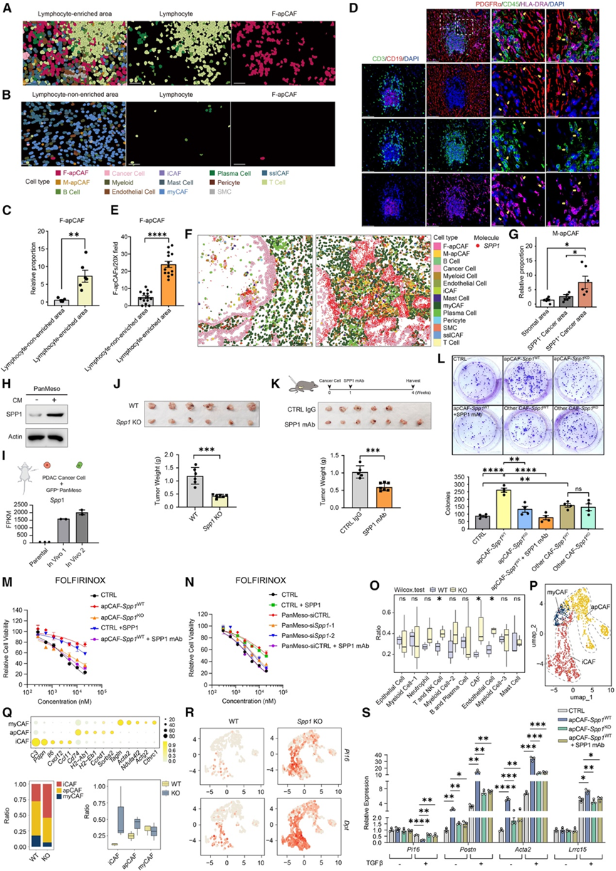 (A) 使用RCTD算法进行反卷积后,显示了PDAC中富含淋巴细胞的微环境中的细胞类型。(B) 使用RCTD算法进行反卷积后,显示了PDAC中非淋巴细胞富集微环境中的细胞类型。(C) 在 PDAC 样本中,对淋巴细胞富集和非富集微环境中的 F-apCAF进行 Xenium 检测定量。(D) 人胰腺导管腺癌组织多重免疫组化染色显示CD3、CD19、PDGFRα、HLA-DRA、CD45和DAPI。(E) 对 PDAC 样本中淋巴细胞富集和非富集微环境中的 F-apCAF进行多重 IHC 定量分析。(F) SPP1-和SPP1+癌区细胞的空间分布和SPP1表达。(G) 对基质、SPP1-和 SPP1 +癌区的 M-apCAF比例进行 Xenium 检测定量。(H) 检测 PDAC 肿瘤 CM 处理后 PanMeso 细胞中 SPP1 的表达。(I) 将 GFP+ PanMeso 细胞与小鼠 PDAC 细胞(BMFA3:体内1 或 CT1BA5:体内2;1:1 比例)共注射形成肿瘤。然后对 GFP+细胞进行流式分选。(J) 将 6620c1 PDAC 细胞原位注射到 WT 或Spp1 KO 小鼠后肿瘤重量。(K) 将 6620c1 细胞原位注射到接受对照抗体或抗 SPP1 mAb治疗的小鼠体内后,肿瘤重量。(L)克隆形成分析。(M) 将 CFSE 标记的 6620c1 细胞与从野生型 (WT) 或Spp1敲除型 (KO) 胰腺导管腺癌 (PDAC) 肿瘤中分离的 apCAFs (PDGFRα+ MHC II+ ) 混合(1:1),并在 FOLFIRINOX 处理后检测其存活率。(N) 将CFSE标记的6620c1细胞与PanMeso细胞(1:1)混合,转染对照siRNA(siCTRL)或两种独立的针对Spp1的siRNA (si Spp1-1和si Spp1-2),并在FOLFIRINOX处理后检测其存活率。(O) 通过scRNA-seq分析野生型(WT)和Spp1 KO肿瘤的细胞类型比例。(P) 从 WT 和Spp1 KO 肿瘤 scRNA-seq 数据中鉴定的 iCAF、myCAF 和 apCAF 聚类。(Q) 上图:CAF亚群中标记基因的表达情况。点的大小表示聚类内表达各基因的细胞比例;颜色表示归一化的表达水平。下图:WT组和Spp1 KO组之间CAF亚型的比例变化。箱线图显示了每种细胞类型比例的范围。(R) 野生型和Spp1 KO肿瘤中sslCAF标记物Pi16和Dpt表达的UMAP。(S) 采用RT-PCR检测PSC与Spp1野生型或KO型apCAF共培养(有或无TGFβ)后基因表达的变化(Pi16、Postn、Acta2、Lrrc15)。