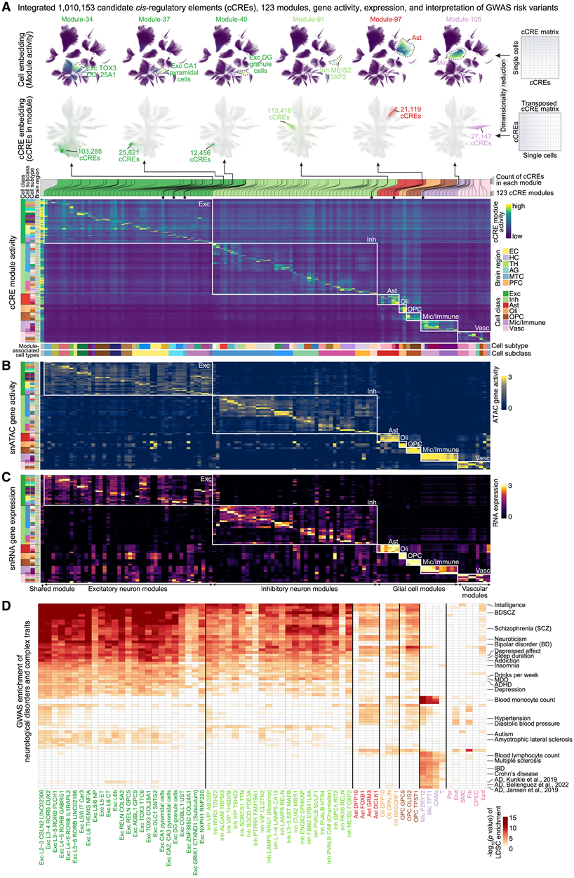 (a)1010153 个 cCRE 的概览,这些 cCRE 组织成 123 个不同的模块。(B) 与 (A) 中相应的 123 个 cCRE 模块相关的基因活性。(C) 与 (A) 中相应的 123 个 cCRE 模块相关的基因的表达。(D) 对 67 个脑细胞亚型中 90 种神经系统、精神系统、神经退行性疾病和其他复杂性状的 GWAS 风险变异进行 LDSC 富集分析。