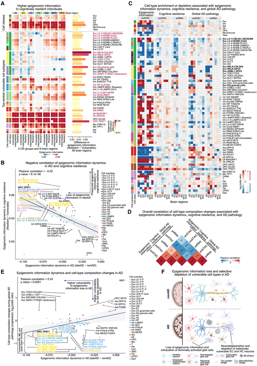 (a) 热图显示,认知恢复力强的个体与认知脆弱的个体相比,在各个大脑区域、细胞类别和排名靠前的脆弱亚型中,拥有更高的表观基因组信息。(B) 表观基因组信息变化与AD进展和CR呈负相关。易损亚型(左上)在AD中表现出表观基因组信息丢失,但在CR中则保持。(C) 与表观基因组信息动态、CR 和 AD 病理进展相关的细胞类型富集或消耗模式。(D) 与表观基因组信息动态、CR 和 AD 病理进展相关的细胞类型分数变化之间的 Pearson 相关性。(E) 根据 snATAC 数据,表观基因组信息丢失与 AD 中的细胞类型耗竭之间存在正相关,突出了脆弱的亚型。(F) 示意图模型展示了与 AD 相关的细胞群落变化,包括表观基因组信息丢失、脆弱脑区的选择性神经元耗竭以及活化神经胶质细胞的耗竭。