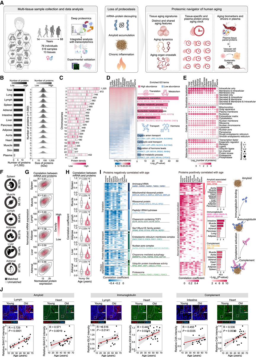 (A) 研究示意图。(B) 左图:每种组织中鉴定出的蛋白质数量。右图:蛋白质大小的密度分布,颜色越深表示数量越多。(C) 检测到的蛋白质在组织中的染色体分布,红色表示密度较高。(D) 左图:跨组织蛋白质丰度热图。右图:高/低丰度蛋白质的富集情况。(E) 按亚细胞定位、细胞成分和跨组织功能划分的检测蛋白质点图。(F) 每种组织的蛋白质环形图。(G) 每种组织的 mRNA-蛋白质 Spearman 相关性的密度图。(H) 按年龄分层的 mRNA 和蛋白质水平的 Spearman 相关性的小提琴图。(I) 左图:蛋白质稳态中与衰老呈负相关的蛋白质。右图:与衰老呈正相关的蛋白质。(J) 淋巴、心脏和肠道中SAA1/2、IGLC、IGHA和C4A的免疫荧光(IF)染色。
