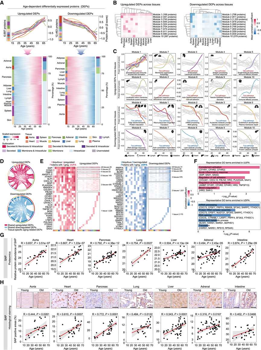 (A) 上图:LOESS 拟合的各组织上调 (左) 和下调 (右) DEP 的缩放表达轨迹(显示数量和比例)。下图:各组织和年龄段上调和下调 DEP 的缩放表达热图,并标明了亚细胞定位分布。(B) 不同组织中上调(左)和下调(右)DEP模块的平均Spearman相关系数热图。(C) 10 个 DEP 模块的年龄轨迹,其丰度增加(上)或减少(下)。(D) 共有和组织特异性上调(左)和下调(右)DEP 的 Circos 图。(E) 不同组织中上调(左)和下调(右)的DEP热图。(F) GO分析。(G) 各组织 SAP 蛋白水平随年龄增长而增加。(H) 免疫组织化学 (IHC) 染色显示年龄相关的 SAP 在各组织中上调。