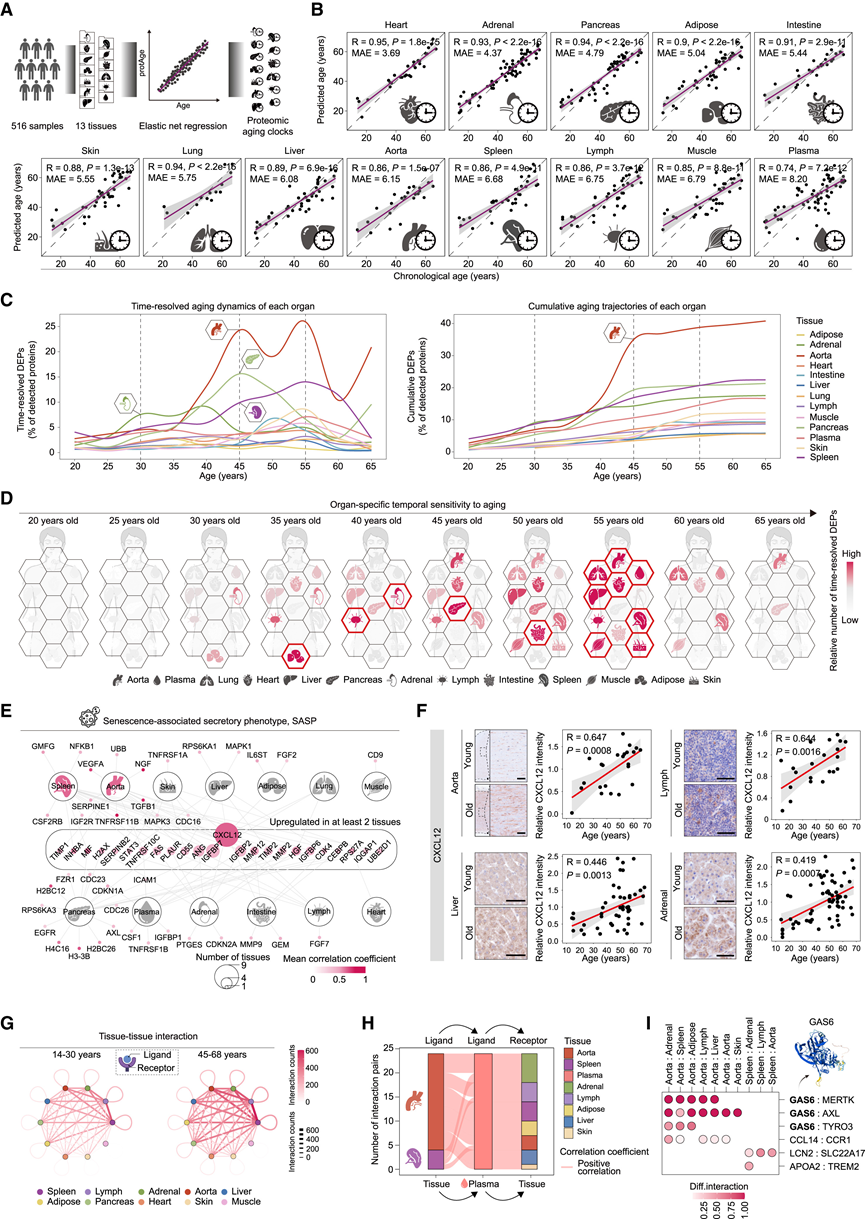 (A) 使用弹性网络回归构建蛋白质组衰老时钟的示意图。(B) 衰老时钟在不同组织中的表现。(C) 不同年龄段动态DEP的滑动窗口分析。(D) 跨组织时间分辨DEP的数字体图。(E) 年龄依赖性上调分泌蛋白网络,与已知 SASP 基因集重叠。(F) 免疫组化 (IHC) 验证多种组织中年龄相关性 CXCL12 表达升高。(G) 组织相互作用网络分析。(H) 血浆介导的跨组织配体-受体相互作用的桑基图。(I) 血浆介导的配体-受体相互作用的年龄相关性变化点图。