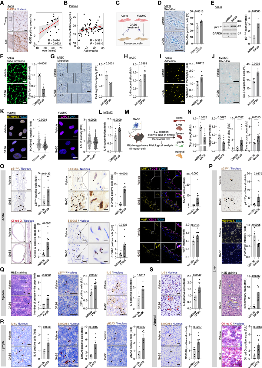 (A) 不同年龄个体血管壁GAS6的IHC染色。(B) ELISA检测显示不同年龄段血浆GAS6水平。(C) GAS6 在 hAEC 和 hVSMC 中治疗的示意图。(D-I) SA-β-Gal 染色、免疫印迹、管形成实验、迁移实验、ELISA和单核细胞粘附实验。(J) 用载体或GAS6处理的hVSMC中的SA-β-Gal染色。(K) IF 染色。(L) ELISA 检测。(M) 实验设计。(N) 对小鼠进行功能测试。(O-S)组织学和免疫荧光染色分析。