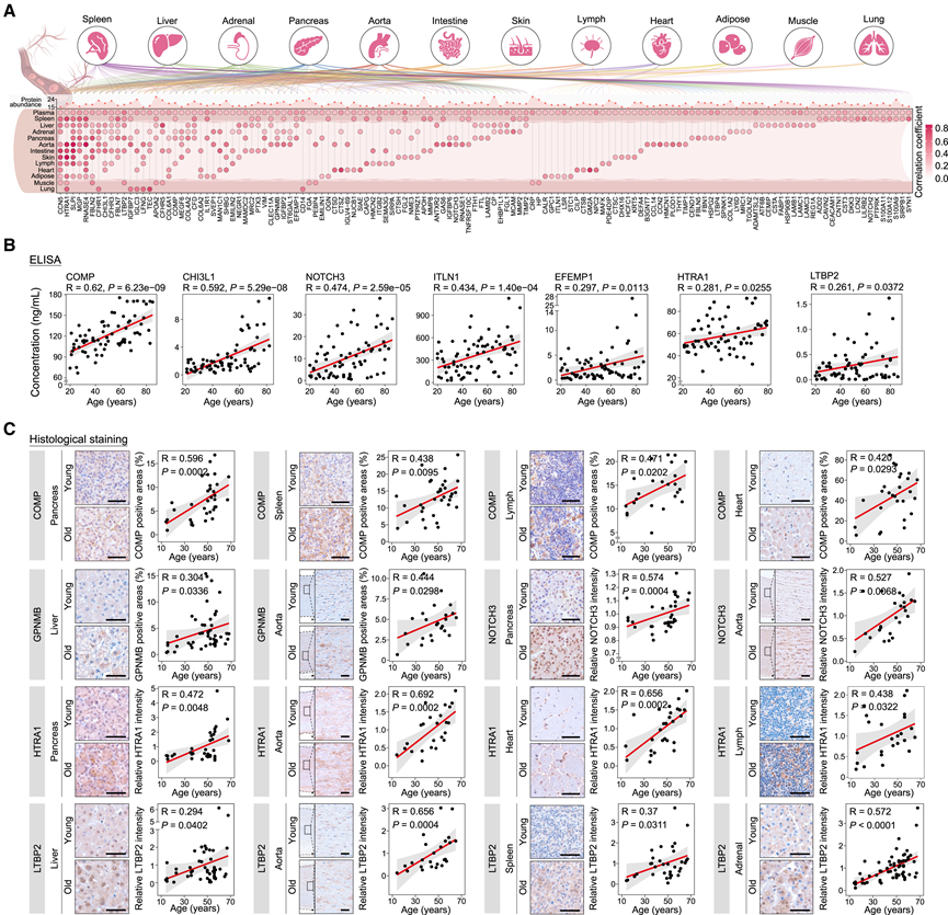 本研究对来自13种人体组织的516个样本,跨越50年的时间,进行了全面的蛋白质组学和组织学分析。这份动态图谱揭示了广泛的转录组-蛋白质组脱钩和蛋白质稳态下降,其特征是淀粉样蛋白的积累。基于衰老相关的蛋白质变化,本研究开发了组织特异性的蛋白质组年龄时钟,并描述了器官水平的衰老轨迹。时间分析显示,衰老拐点出现在50岁左右,而血管是一种较早衰老且极易受衰老影响的组织。本研究进一步定义了与其组织来源相匹配的衰老血浆蛋白质组学特征,并鉴定了包括GAS6在内的驱动血管和全身衰老的候选衰老蛋白。总之,这项研究成果为从蛋白质的视角系统性地理解人类衰老提供了新的理论依据。
