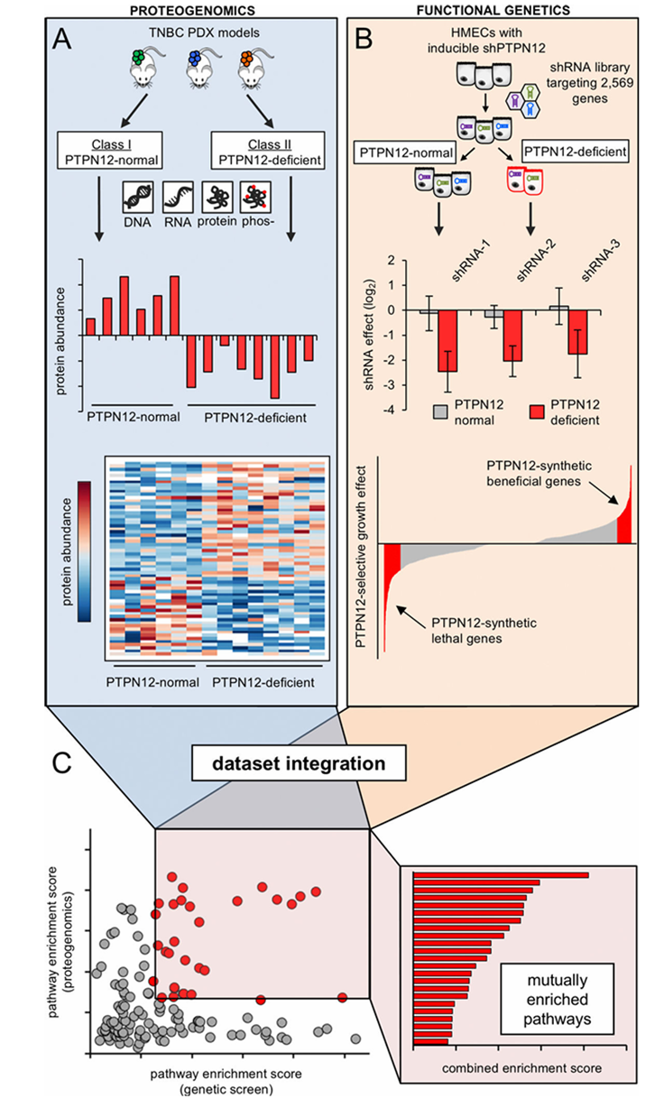 (A) 对一组TNBC患者来源异种移植(PDX)模型进行了蛋白质组学表征。(B) 基因筛选,以识别在PTPN12缺陷细胞中选择性必需的基因。(C) 利用基因集富集分析(GSEA)整合。