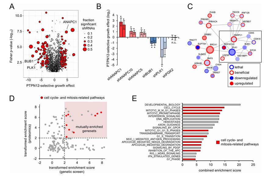 (A) 火山图展示了合成致死筛选的结果,用于鉴定PTPN12选择性生长调节因子。(B) PLK1和BUB1的敲低导致PTPN12合成致死,而多个APC组分的敲低则导致PTPN12合成有益。(C) shRNA筛选和蛋白质组学显著结果的网络分析。(D) 蛋白质组学和基因筛选数据集的GSEA分析。(E) 与细胞周期进程调控和有丝分裂检查点信号传导相关的REACTOME通路在基因筛选和蛋白质组学数据集中均富集。