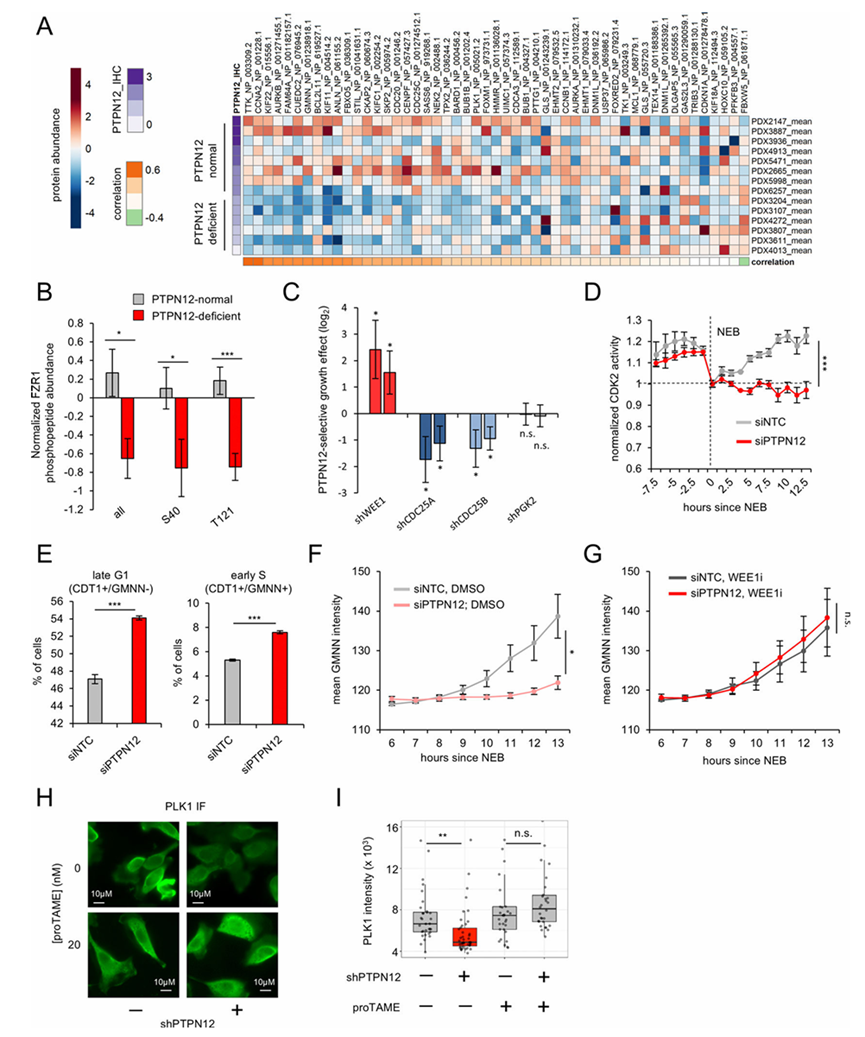 (A) TNBC PDX模型中,PTPN12状态与APC底物丰度相关。(B) PTPN12缺陷型PDX模型中特定FZR1残基的磷酸化水平降低。(C) CDK2活性调节因子是PTPN12选择性生长调节因子。(D) PTPN12缺失会损害CDK2的激活。(E) PTPN12失活导致G1期和早期S期细胞的积累。(F) PTPN12耗竭导致S期GMNN积累延迟。(G) PTPN12 缺陷细胞中 GMNN 的延迟积累可通过抑制 WEE1 来抑制。(H) PTPN12 缺陷导致 PLK1 异常耗竭,而 APC 抑制剂可挽救这种耗竭。(I) APC 抑制剂可挽救 PTPN12 缺陷引起的 PLK1 异常耗竭。