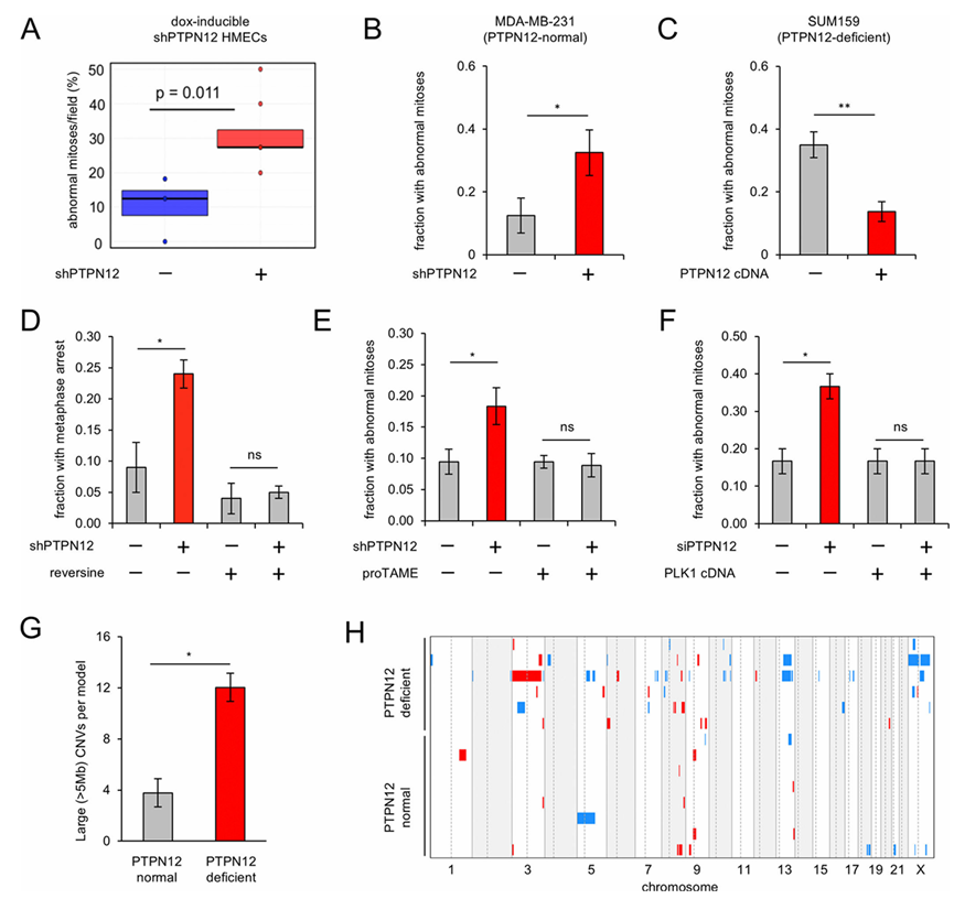 (A) PTPN12 敲低导致多种有丝分裂缺陷。(B) PTPN12 敲低导致 MDA-MB-231 三阴性乳腺癌细胞有丝分裂缺陷。(C) PTPN12 的重新表达挽救了 PTPN12 缺陷型 SUM159 三阴性乳腺癌 (TNBC) 细胞的有丝分裂缺陷。(D) PTPN12 缺陷型细胞的中期阻滞是由纺锤体组装检查点 (SAC) 激活引起的。(E) APC抑制剂可挽救PTPN12缺失引起的有丝分裂缺陷。(F) PTPN12缺陷细胞的有丝分裂缺陷是由PLK1缺失驱动的。(G) PTPN12缺陷的PDX模型表现出染色体不稳定性(CIN)增加。(H) 热图展示了PTPN12表达正常和缺陷的PDX模型中大CNV的发生率和分布。