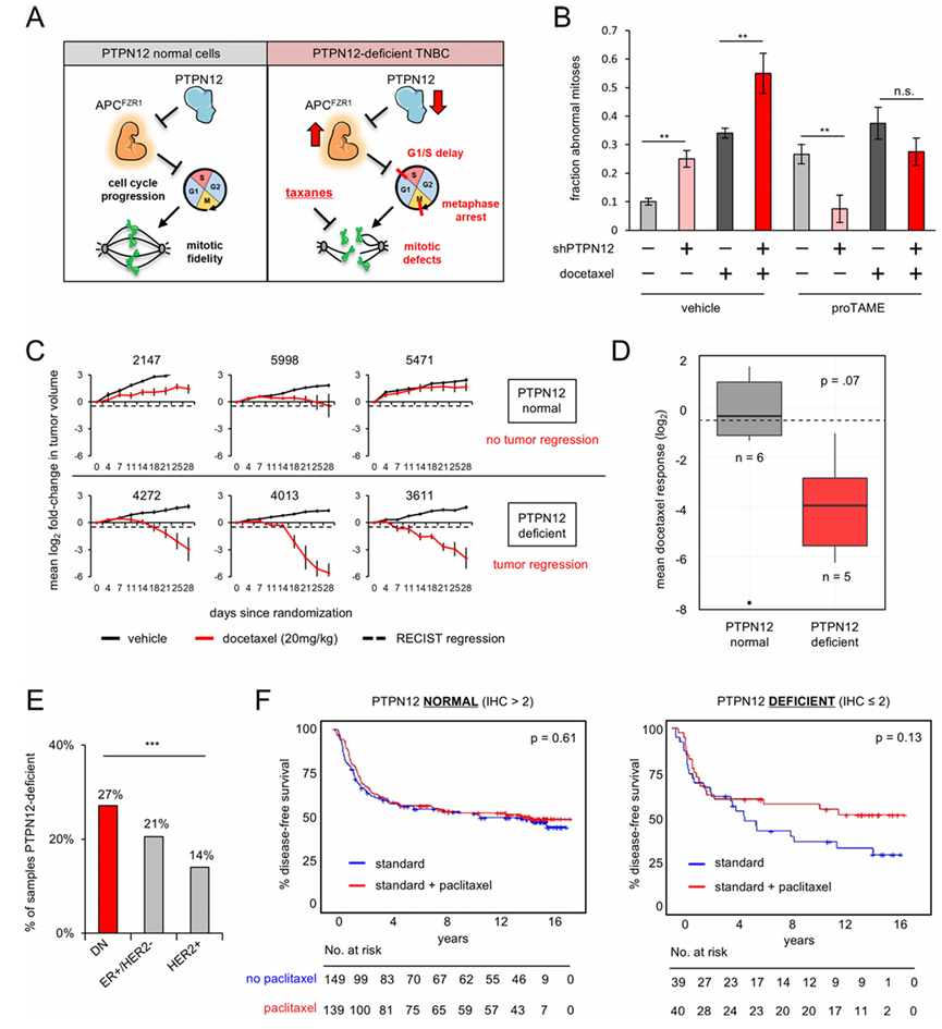 (A) APCFZR1过度激活导致 PTPN12 缺陷型TNBC细胞有丝分裂缺陷。(B) APC 抑制剂可抑制紫杉烷类药物治疗引起的 PTPN12 缺陷型细胞有丝分裂缺陷的增加。(C) PTPN12 缺陷型患者来源PDX对多西他赛的反应更强。(D) PDX模型的多西他赛反应。(E) 超过25%的三阴性乳腺癌(TNBC)中PTPN12蛋白表达缺失。条形图显示了CALGB9344研究中ER+/HER2−、HER2+和双阴性(DN)亚型患者标本中PTPN12低表达(IHC≤2)的比例。(F) 在CALGB9344研究中,PTPN12缺陷型肿瘤患者从辅助紫杉醇治疗中获益更多。