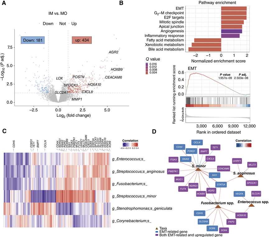 (A) 火山图显示IM 和 MO 肿瘤结节之间的差异表达基因。(B) 基因集富集分析表明,在 IM 和 MO 结节之间差异调控的标志性信号通路。(C) 热图显示了通过 Spearman 相关性在 IM 结节中识别的差异微生物类群(行)和宿主基因(列)之间的相关性模式。(D) 网络分析显示 IM 结节中富集的肿瘤内微生物及其与转移相关的宿主基因的相关性。