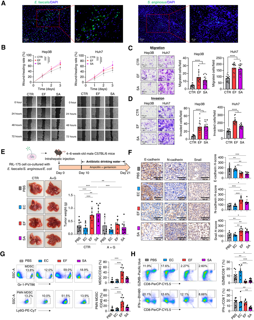 (A) 代表性FISH图像,显示在多灶性HCC患者肝组织中检测到粪肠球菌(左)和咽峡炎链球菌(右)。(B) 伤口愈合试验分析。(C-D) 与 EF 和 SA 共培养的人 HCC 细胞系(Hep3B 和 Huh7)中的迁移和侵袭试验的代表性图像和定量。(E) 说明构建具有原位 HCC 同种异体移植的 SPF C57BL/6 小鼠模型的示意图。(F) IHC 染色代表性图像。(G-H)流式细胞分析。