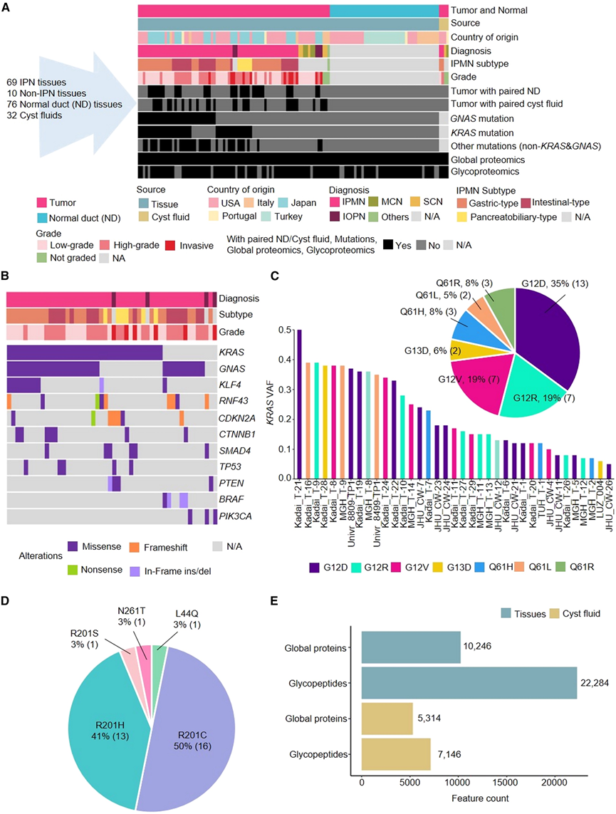 (A) 根据样本类型、组织学亚型、组织学等级和可用数据类型对队列进行分布。(B) 突变景观。(C) KRAS VAF 和KRAS热点突变的分布。(D) GNAS热点突变的分布。(E) 从整个队列的组织和囊液中鉴定出的总蛋白质和糖肽。