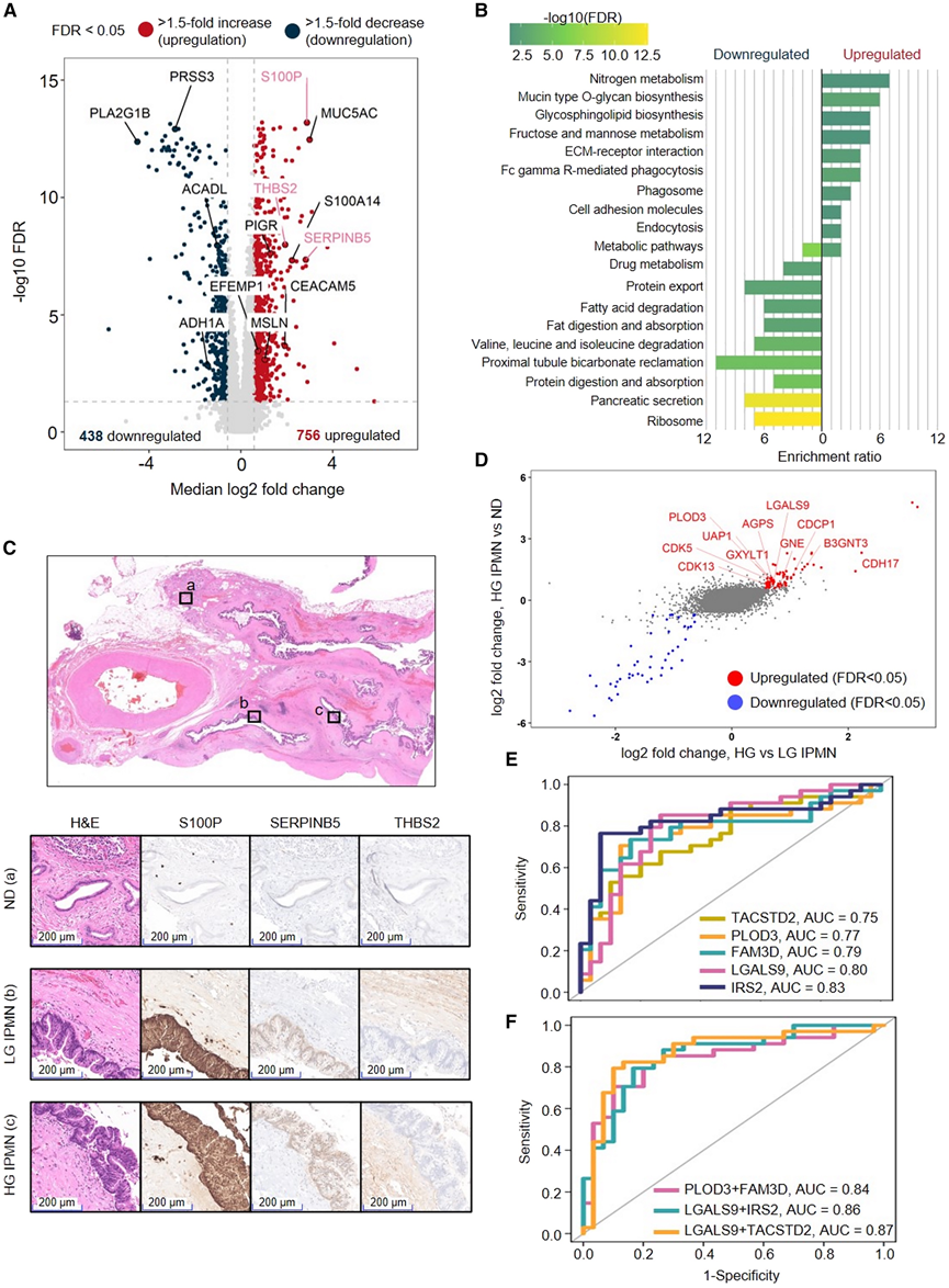 (A) 64例IPMN与76例正常导管组织(ND)的比较。(B) KEGG 通路富集了 IPMN 组织中相对于 ND 的上调和下调蛋白。(C) ND、低级别 (LG) IPMN 和高级别 (HG) IPMN 中 S100P、SERPINB5 和 THBS2 的 IHC 标记结果。(D) 34例HG IPMN中显著上调(红色)和下调(蓝色)的蛋白质。(E) 根据 ROC 分析,单个蛋白质显示出对 HG IPMN 检测的潜在临床实用性。(F) 多蛋白质组合提高了区分 HG IPMN 与 LG IPMN 的性能。