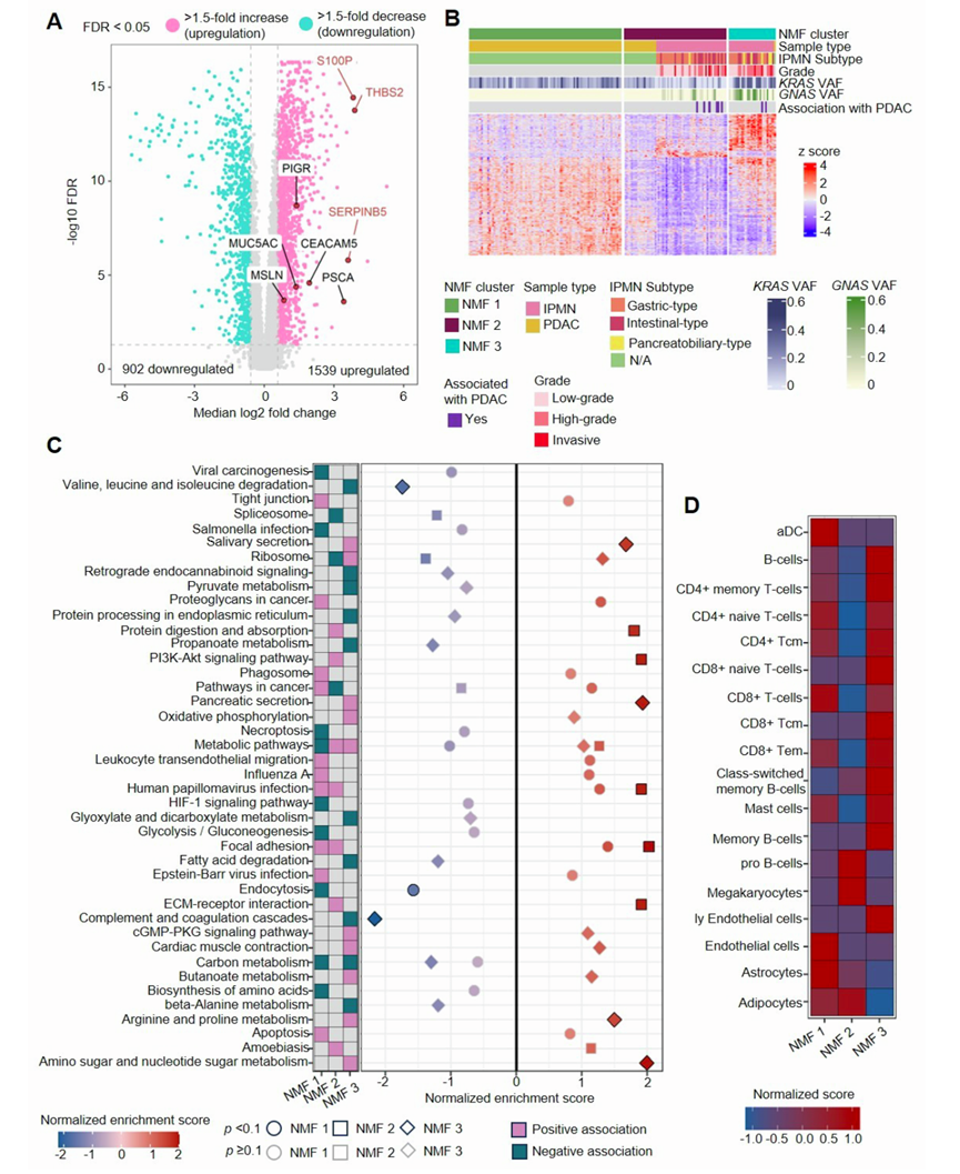 IPMN 在形态上可分为三种亚型:胃型、肠型和胰胆型。此外,根据细胞结构异形性程度和有无相关侵袭性癌症,IPMN 可分为低度不典型增生、高度不典型增生和相关侵袭性癌症。他们将基于蛋白质组学的 NMF 亚型策略应用于 IPMN 和 PDAC,以探索肿瘤异质性并揭示进展特征。该分析显示了三个聚类(NMF1-3):NMF 1 完全由 PDAC 组成,NMF 2 包括一些 PDAC 和一些 IPMN,而 NMF 3 几乎完全由只有一个 PDAC 的 IPMN 组成(图S4B)。大多数(75%)伴有 PDAC 的 IPMN 聚集在 NMF 2 中。使用特征蛋白进行 KEGG 通路富集可区分这三个聚类(图S4C)。值得注意的是,NMF 3 在氨基糖代谢、代谢过程和胰腺分泌方面富集。NMF 3 中的几种粘蛋白糖基化相关酶,例如 UDP-半乳糖-4-差向异构酶 (GALE)、谷氨酰胺-果糖-6-磷酸氨基转移酶 1 (GFPT1)、GNE 和葡萄糖胺-磷酸 N-乙酰转移酶 1 (GNPNAT1),都参与氨基糖代谢。NMF 3 中发现的钠/钾转运 ATP 酶 (ATP1A1、ATP1B1) 和 ADP/ATP 转位酶 (SLC25A4) 是代谢过程中的关键参与者。NMF 3中发现的 Ras 相关蛋白 (RAB27B、RAB3D) 控制着分泌囊泡的成熟、运输和胞吐,在胰腺分泌中尤为突出。NMF 3 的这些独特特性表明,与粘蛋白聚糖合成增加和细胞外囊泡分泌相关的代谢过程发生了重编程。NMF 2 和 NMF 3 之间的主要差异包括 NMF 2 中胶原蛋白和基质蛋白(COL4A1、COL4A2、COL4A5、COL6A1、COL6A2、COL6A3、TNXB)升高,这些蛋白在 ECM-受体相互作用、PI3K-Akt 信号传导等途径中富集(图 4G)。这些发现强调了从 IPMN 到 PDAC 进展过程中 ECM 相互作用的重组。在 NMF1 中,明胶酶 A(MMP2)和 FN1,以及糖蛋白层粘连蛋白(LAMB3、LAMA3)和膜相关调节蛋白(ANXA2、ANXA5),突出了癌症中的细胞粘附和迁移途径以及蛋白多糖相互作用(图 4G)。