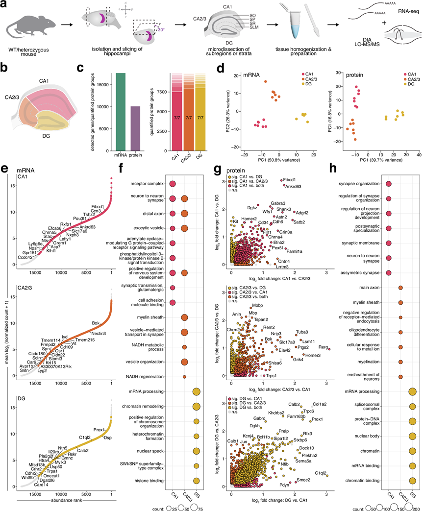 (a) 组织分析的实验流程。(b) 示意图显示为准备组织而进行显微切割的 CA1、CA2/3 和 DG 亚区域。(c) 左图:所有亚区域中检测到的 mRNA 转录本总数和定量蛋白质组。右图:每个亚区域定量蛋白质组的有效值条形图。(d) 转录组(左)和蛋白质组(右)的主成分分析 (PCA) 显示了按亚区域聚类的情况。(e) mRNA的等级丰度图表示给定亚区域中转录本的相对丰度。(f) 基于与其他两个亚区域相比每个亚区域中显著富集的转录本。(g) 散点图显示每个亚区域中蛋白质相对于其他两个亚区域的富集。(h) 基于每个亚区域中与其他两个亚区域相比显著富集的蛋白质的过度表达分析。