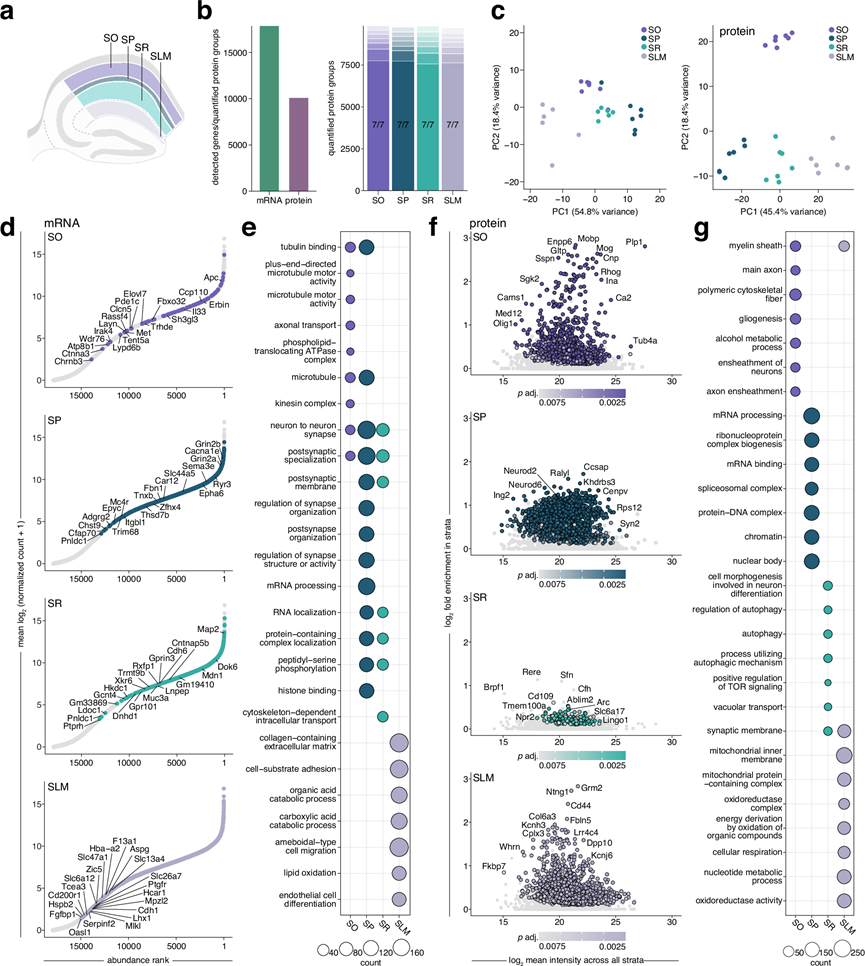 (a) 示意图显示显微切割的 CA1 层 SO、SP、SR 和 SLM。(b) 左图:所有层中检测到的总 mRNA 转录本和定量蛋白质组数据。右图:每个层定量蛋白质组的有效值条形图。(c) 转录组(左)和蛋白质组(右)的PCA显示了层特定的聚类。(d) mRNA的等级丰度图表示与整个 CA1 相比,给定层中转录本的相对丰度。(e) GO分析。(f) 蛋白表达强度分析。(g)GO分析。