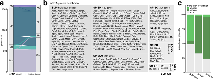 (a) 冲积图显示了不同 SO、SP、SR 和 SLM 组合中 mRNA 及其相应蛋白质的富集位点。(b) 平铺图显示了基于 mRNA-蛋白质富集的候选基因。(c) 根据其编码的蛋白质的富集位点,在体细胞或神经丛中优先翻译的 mRNA 比例。