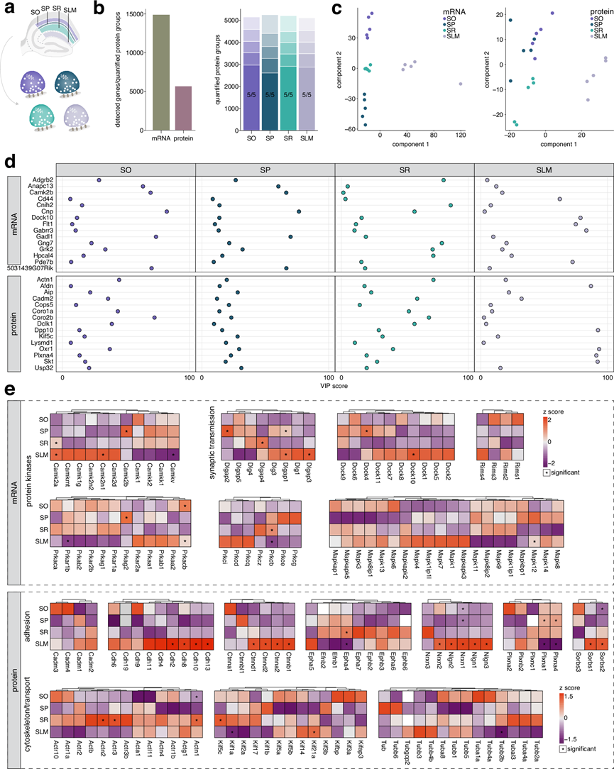 (a) 显微切割层的突触体示意图。(b) 左图:每个层经过污染物过滤后,在纯化的突触体中检测到的转录本和定量的蛋白质组。右图:每个层定量蛋白质组的有效值条形图。(c) PLS -DA 图显示转录组和蛋白质组的层分离。(d) 投影变量重要性 (VIP) 图显示 PLS-DA 中前三个成分的前五个负载的 VIP 分数。(e) 候选热图显示 CA1 神经元沿突触的 mRNA 和蛋白质表达模式。