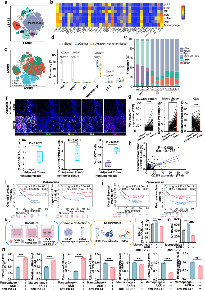 (a) t-SNE可视化食管鳞状细胞癌(ESCC)患者髓系细胞亚群的分布。(b) 热图显示髓系细胞亚群中代表性蛋白标记物的平均表达水平。(c) t-SNE可视化ESCC患者髓系细胞亚群的来源。(d) 箱线图显示不同来源ESCC患者髓系细胞亚群的分布。(e) 堆叠条形图显示ESCC患者血液、邻近非肿瘤组织和肿瘤组织中主要髓系细胞的频率。(f) 采用多重免疫组化(mIHC)探索ESCC组织内免疫细胞的空间分布。(g) 比较ESCC肿瘤与邻近非肿瘤组织中 CD274 (PD-L1)的表达水平,以及ESCC肿瘤与邻近非肿瘤组织中浸润巨噬细胞和CD8+ T细胞的比例。(h) ECGEA队列(RNA-seq)ESCC肿瘤样本中CD274 mRNA水平与CD8+ T细胞浸润之间的相关性。(i-j) 黑色素瘤和泛癌免疫治疗队列中总生存期(OS)和无进展生存期(PFS)的Kaplan-Meier曲线。(k) 巨噬细胞和肿瘤细胞共培养模式示意图。(l-n) 流式细胞分析定量PD-L1和ELISA法检测培养上清液中的IL-4。